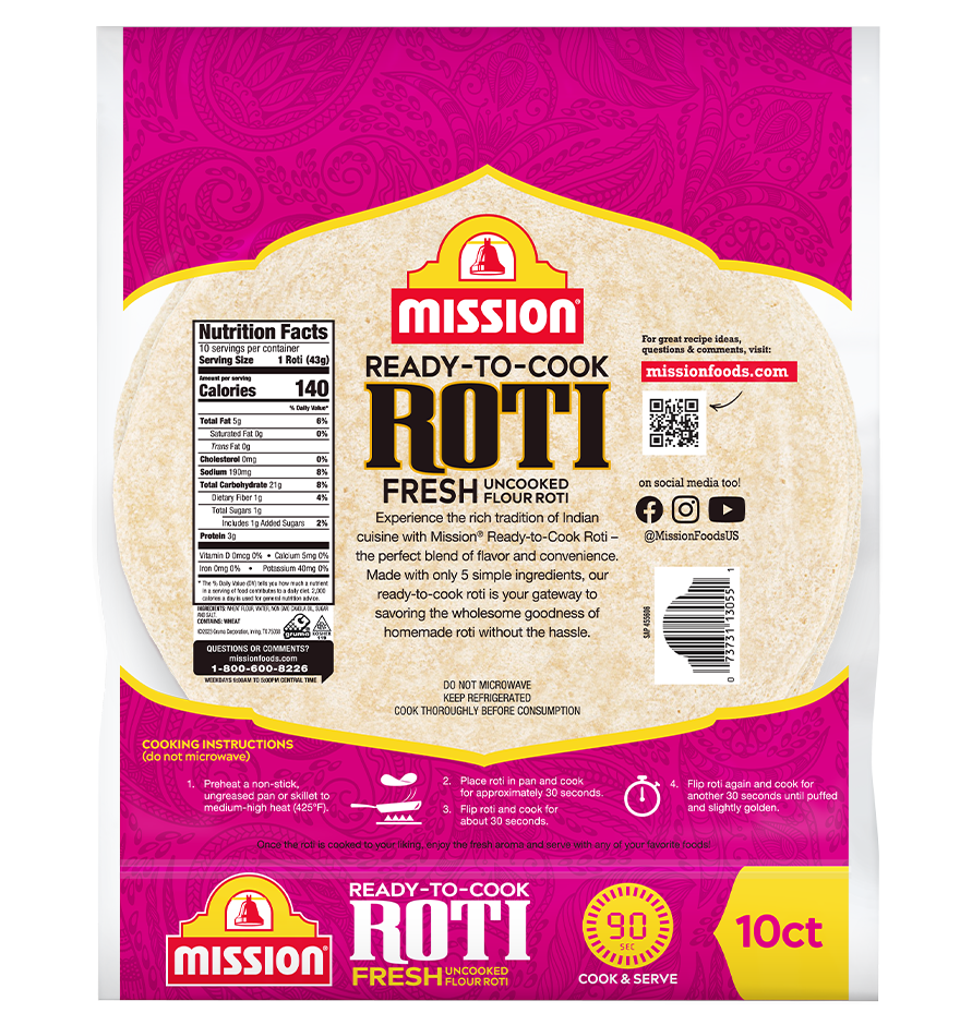 Experience the rich tradition of Indian cuisine with Mission® Ready-To-Cook Roti – the perfect blend of flavor and convenience. Made with only 5 simple ingredients, our Ready-To-Cook Roti is your gateway to savoring the wholesome goodness of homemade roti without the hassle.